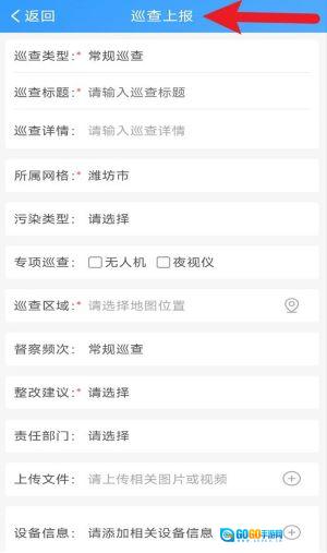 2、在巡查上报页面填写巡查类型、标题、详情、所属网格、污染类型等具体信息,并上传相关文件。