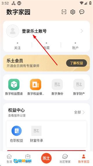 2、在数字家园页面找到并点击“登录乐土账号”按钮,即可跳转至登录页面。