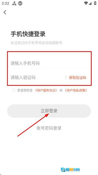 3、在登录页面输入手机号与验证码,勾选相关协议后,点击“立即登录”按钮,即可完成账号登录流程。