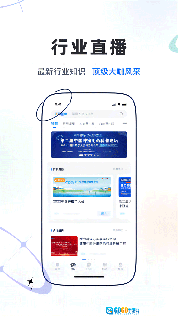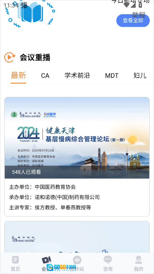 2、会议模块:可查看学术会议列表、直播及预告,并能实时参与学术交流。