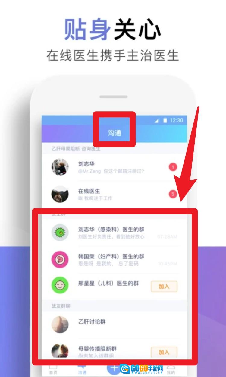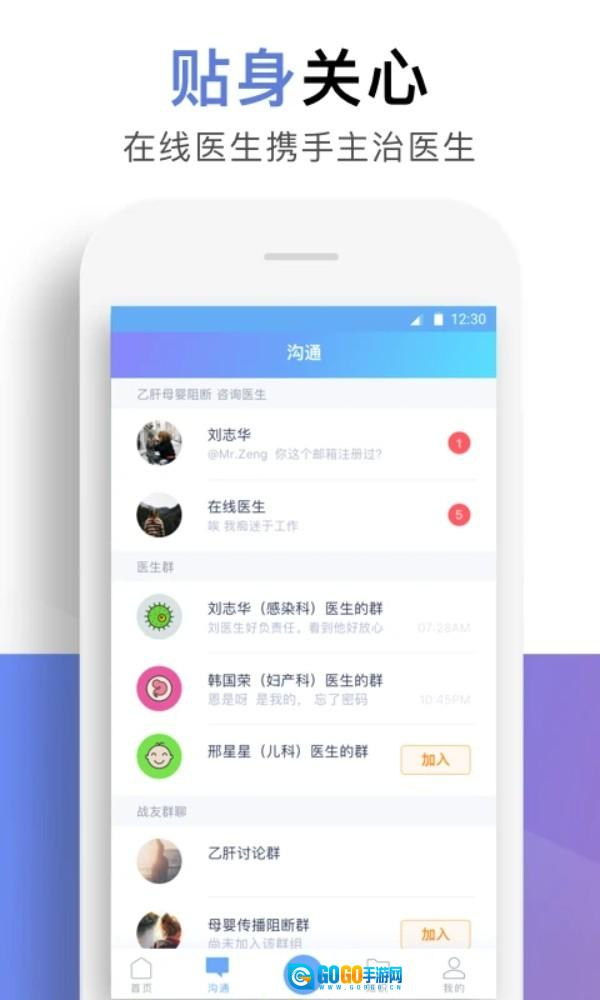 4. 点击底部的沟通菜单,即可进入医生群聊区域,这里支持加入感染科、产科、儿科等不同科室的群组,您可以在线与医生进行实时互动交流。