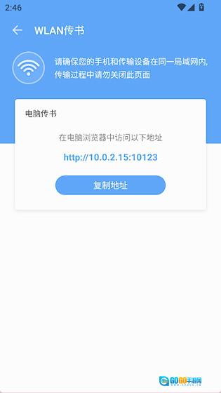 3、手机与电脑连接同一WiFi,在电脑浏览器里输入显示的地址进行传书