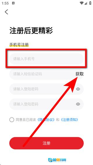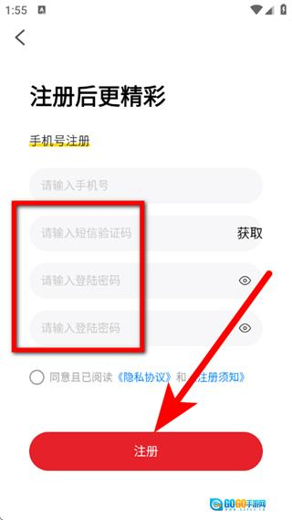 4、输入短信验证码及登录密码,勾选协议后,点击注册,完成注册。