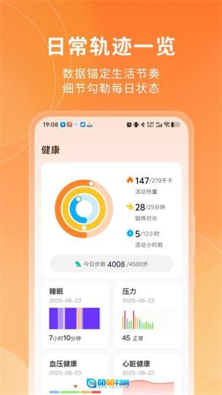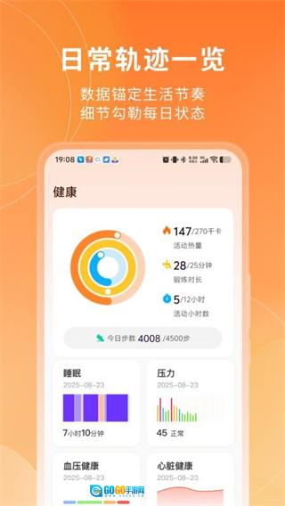 实时捕捉运动步数、心率波动等核心数据,同步监测睡眠质量、血氧饱和度等健康指标,数据更新延迟小,可随时掌握身体动态,及时调整运动与作息节奏。