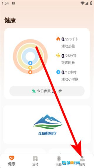 1、打开山威运动健康应用,进入健康板块,点击底部的“我的”选项,进入个人页面。