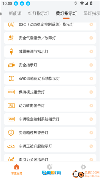 2、在软件首页中下滑找到“保险”功能模块来左滑点击“黄灯指示灯”按钮进入下一步。
