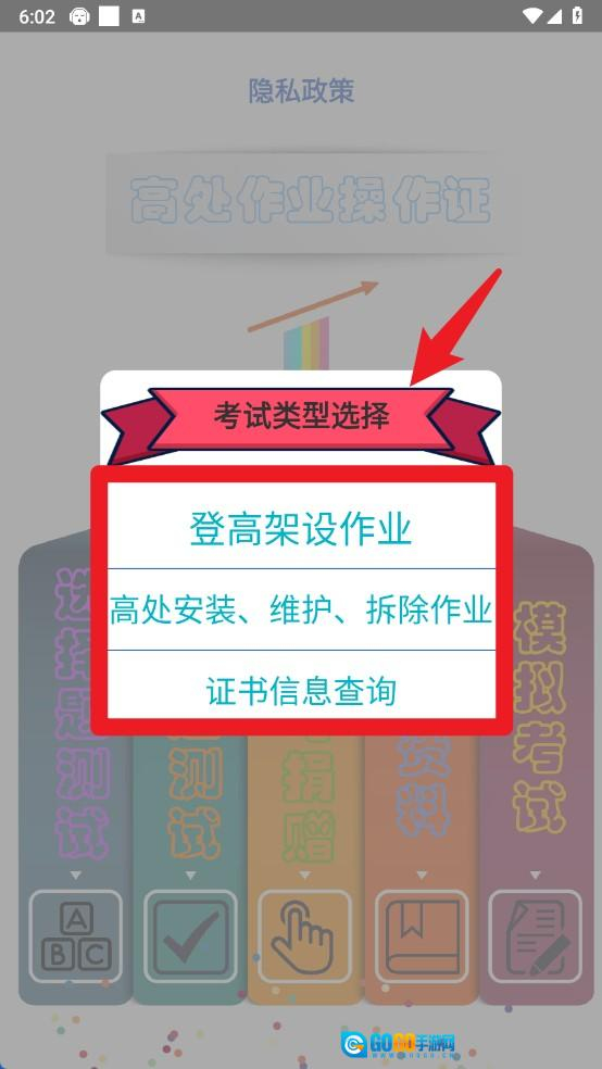 1、进入首页后点击考试类型选择按钮,用户可选择对应工种类型或进行证书信息查询操作。