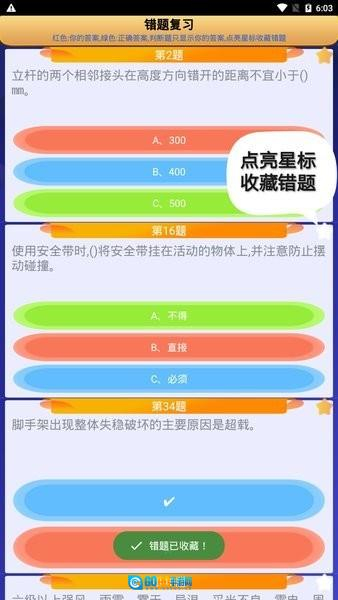 2、新增错题收藏与错题复习功能,在模拟考试错题复习界面,点击右上角的星标可以收藏错题。