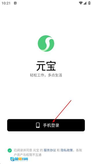 2、进入腾讯元宝的主登录页面后,点击页面上的手机登录选项,即可进入手机号登录界面。