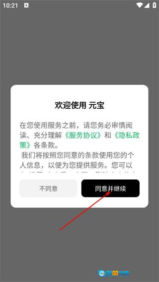 1、在腾讯元宝的欢迎使用弹窗里,仔细阅读服务协议与隐私政策后,点击“同意并继续”按钮。