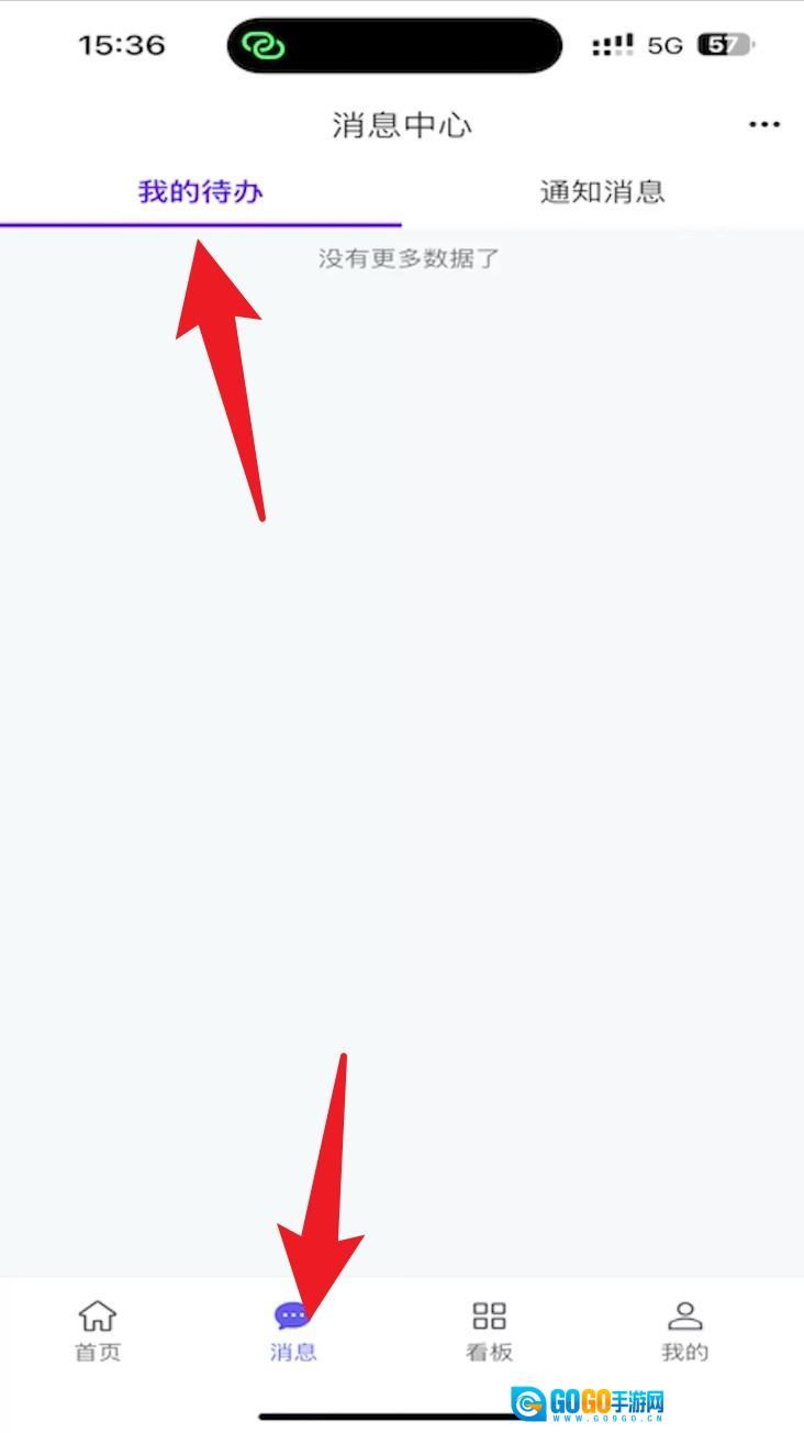3. 点击底部导航栏的“消息”按钮进入消息中心,接着选择页面上方的“我的待办”选项,即可查看待处理的事项。