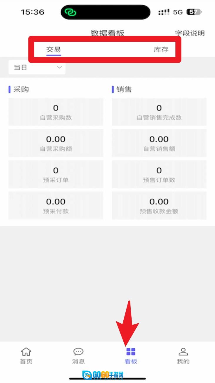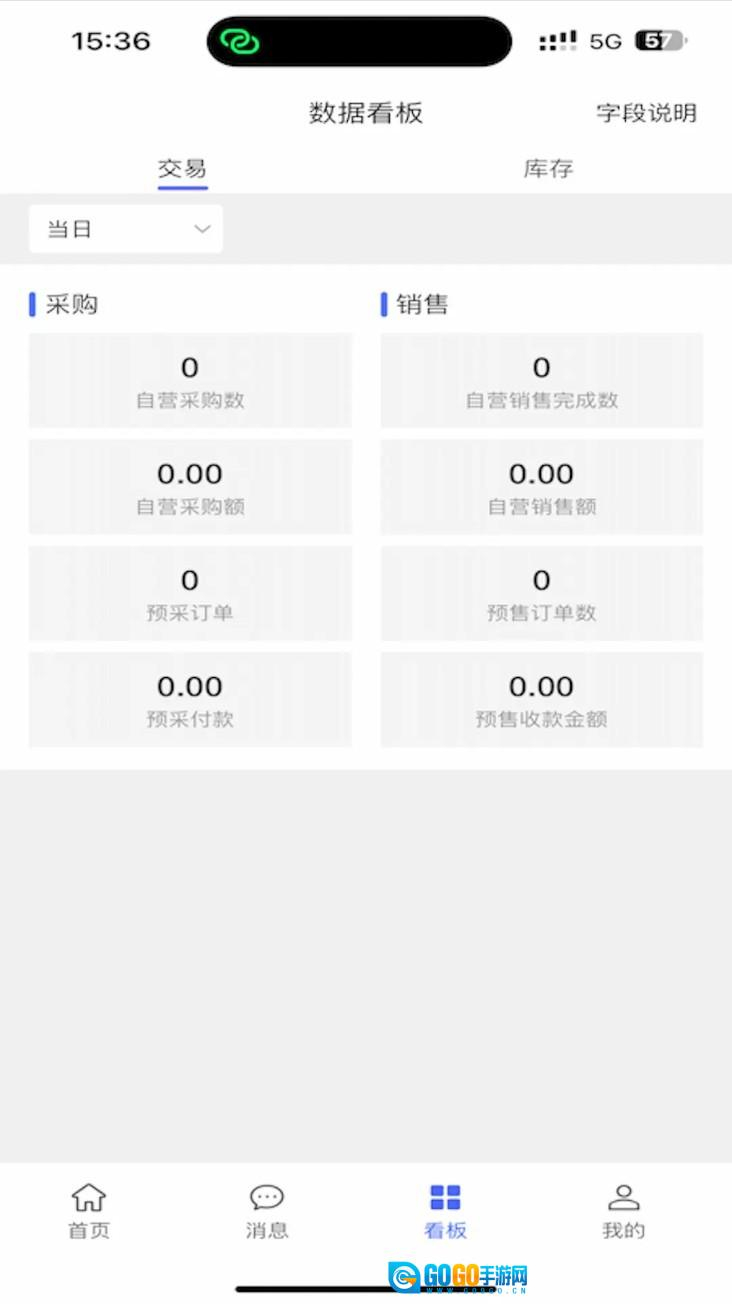 4. 切换到底部导航栏的看板页面,即可查看交易与库存数据,该页面支持按日维度查看采购及销售相关指标。
