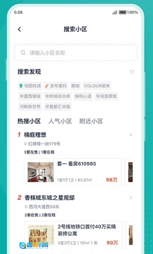 只需一键点击小区搜索功能,本地热搜小区、人气小区以及附近小区的相关信息便会呈现,小区房屋的售价与出租价格也能轻松获取。