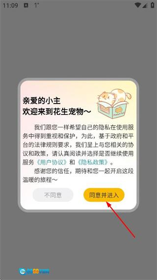 在花生宠物的欢迎弹窗里,点击“同意并进入”按钮,就能进入应用引导页面。