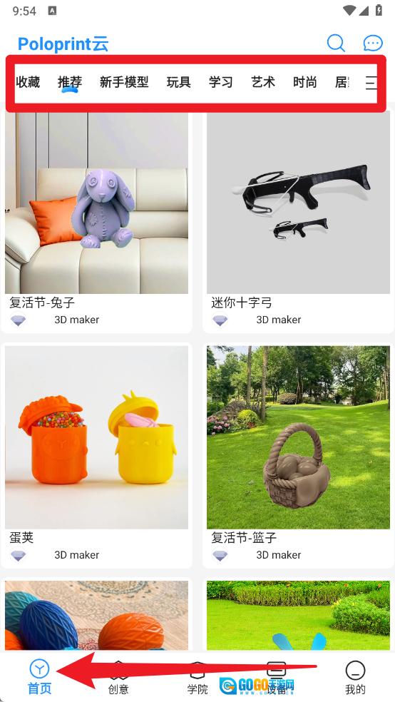 3、首页顶部设有收藏、推荐、新手模型等分类标签,便于用户快速浏览和挑选3D模型。