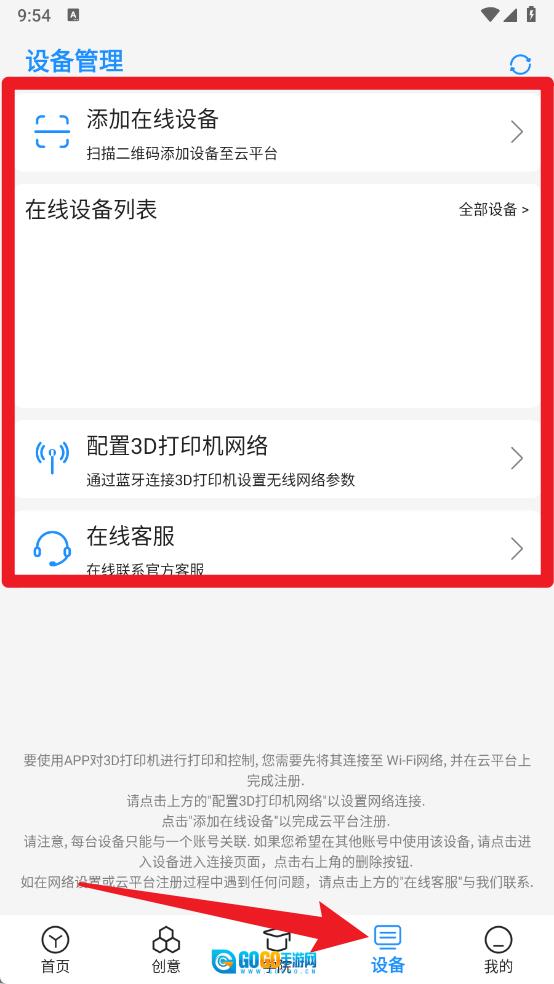 6、设备管理界面支持在线设备添加、3D打印机网络配置以及在线客服联系功能。