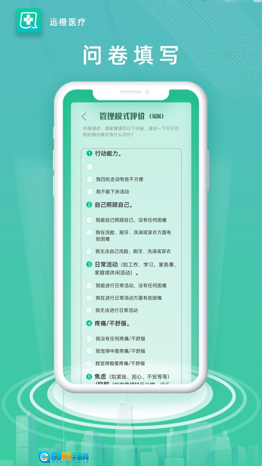 5、在问卷填写的功能模块里,用户能够依照系统提示完成健康管理方面的评估,评估内容涵盖行动能力、日常活动表现、身体的疼痛与不适感以及心理状态等多个维度的信息。