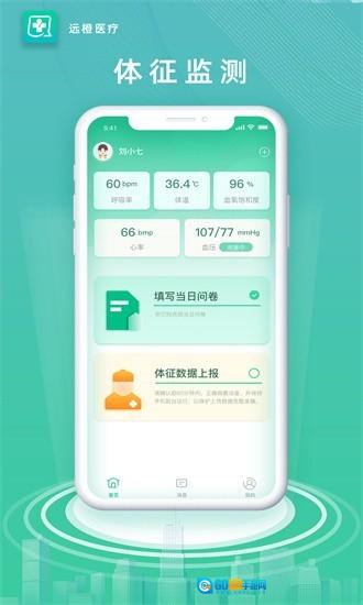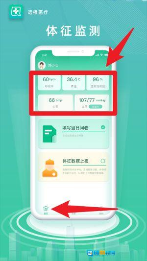 3、进入首页后,在体征监测页面,能够实时查看呼吸率、体温、血氧饱和度、心率以及血压等健康数据,还可以完成当日问卷的填写和数据的上报。