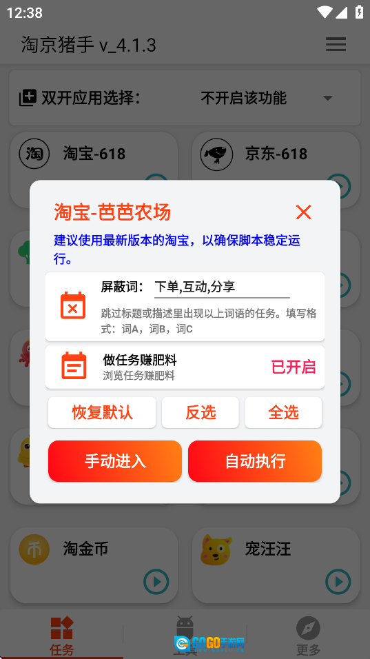 5、问:某个任务出现无法完成、陷入无限循环或无法加载的情况该怎么处理? 答:您可以先尝试手动执行该任务;如果手动执行没有效果,可以点击任务图标,把对应的任务名称添加到屏蔽关键词列表中;要是没有找到屏蔽选项,您可以向任务的作者反馈这个问题。