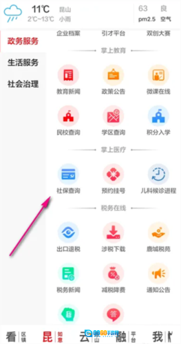 1、在软件主界面,找到掌上医疗,点击社保查询。