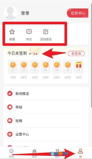 5、在“我的”页面中,用户能够查看自己的收藏内容、评论记录以及活动报名状态,还可以进行新闻推送设置、访问商城和投稿等个性化操作。