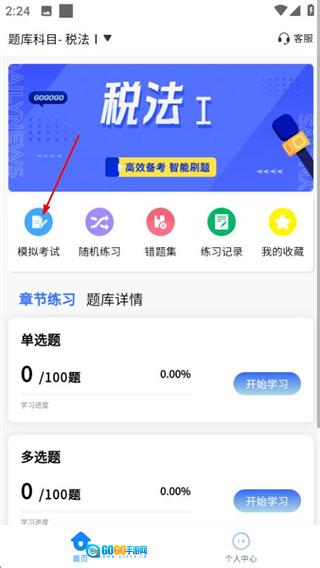 1、在税务师考试学知题的首页,找到并点击模拟考试选项,即可进入模拟考试页面。