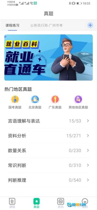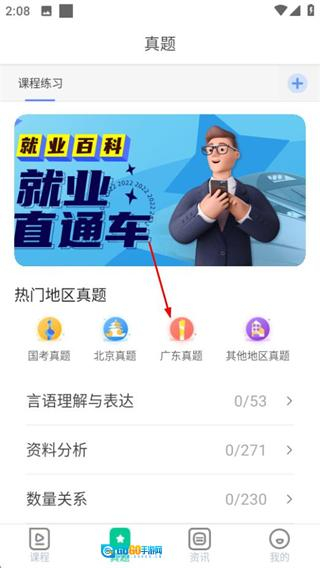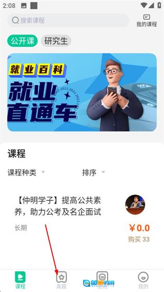 在就业直通的课程页面,点击底部的真题选项,即可进入真题页面。