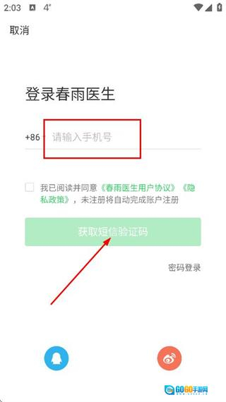 3、在登录页面填写手机号,勾选相关协议后,点击获取短信验证码。