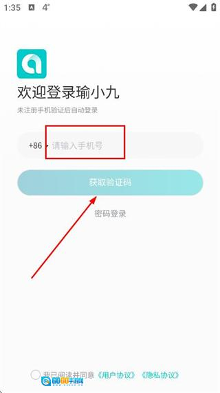2、在手机登录界面输入手机号,勾选相关协议后,点击“获取验证码”按钮。