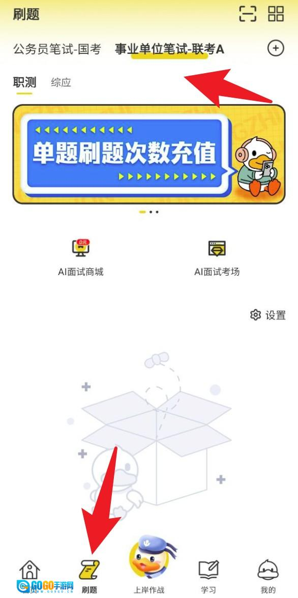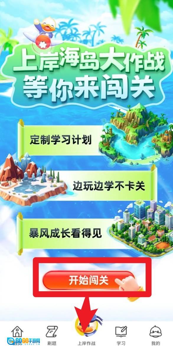 3. 于上岸作战界面点击红色按钮开启闯关,解锁学习地图,依照关卡任务高效推进备考进程。