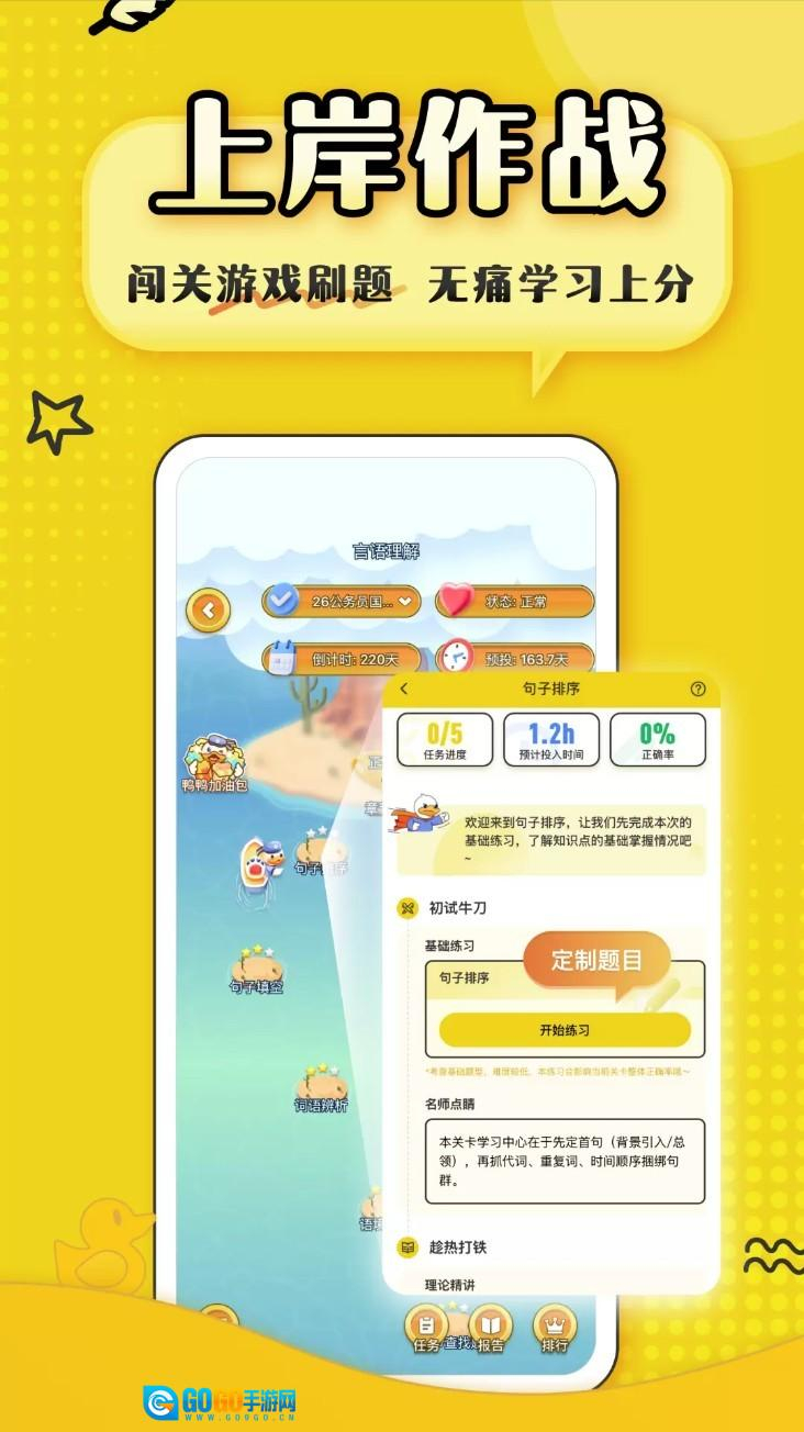 上岸鸭公考是一款面向公务员、事业单位、教师编制等各类公职考试备考人群打造的线上刷题与综合学习平台。它为用户提供申论写作素材库、历年真题模拟练习、个性化智能刷题系统以及配套的智能教辅分析工具,深度整合了知名讲师的教学资源和海量优质题库内容,助力考生在高效学习与互动体验相融合的过程中,轻松掌握各类考试的核心考点与解题技巧。