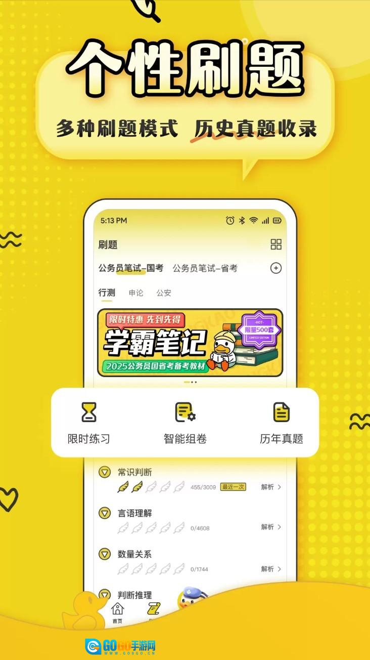 1、海量题库资源:整合历年国考及省考行测、申论的真题与模拟题,为用户提供体系化的训练内容。