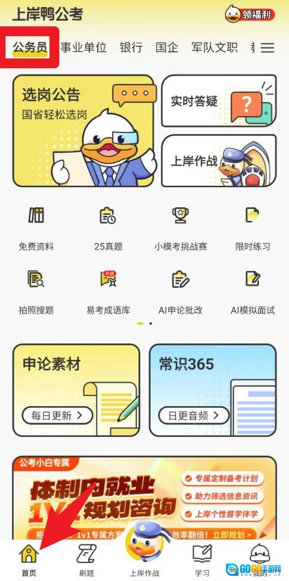 1. 在首页点击顶部的公务员或事业单位标签,就能切换到对应的考试模块,查看相关的内容和资源。