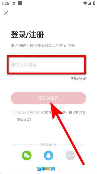 3、进入登录注册界面后,先输入手机号,接着勾选相关协议,再点击发送验证码按钮。