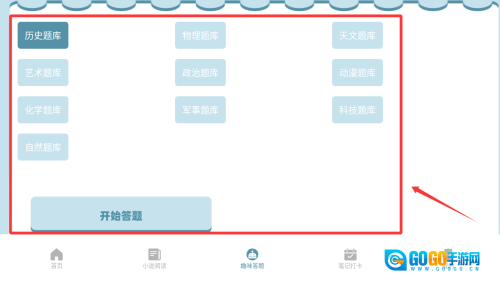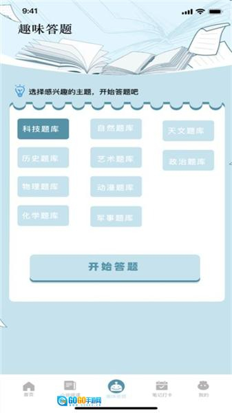 提供多种题库,包括科技、自然、天文、历史、艺术、政治、物理、动漫、化学和军事等,用户可以选择感兴趣的主题进行答题,增加知识储备。