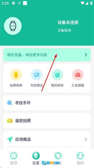 2、在设置页面点击绑定设备选项,进入搜索手环页面。