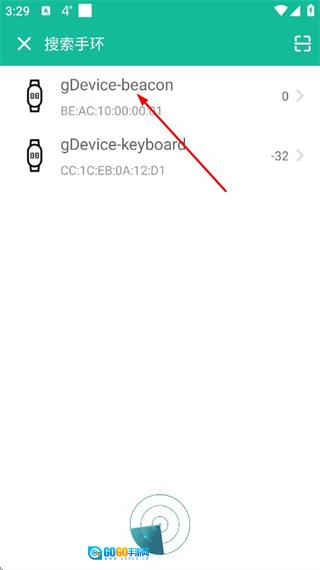 3、在搜索手环页面点击目标手环设备,进行设备绑定操作。