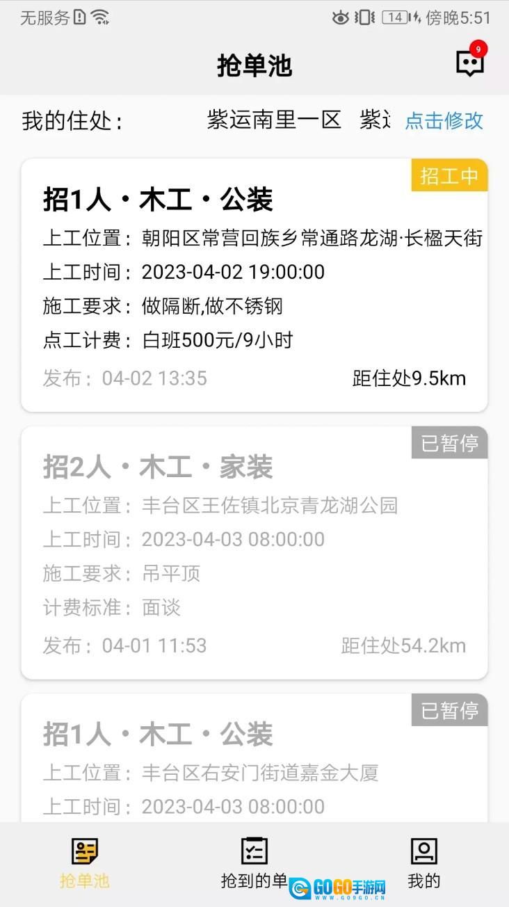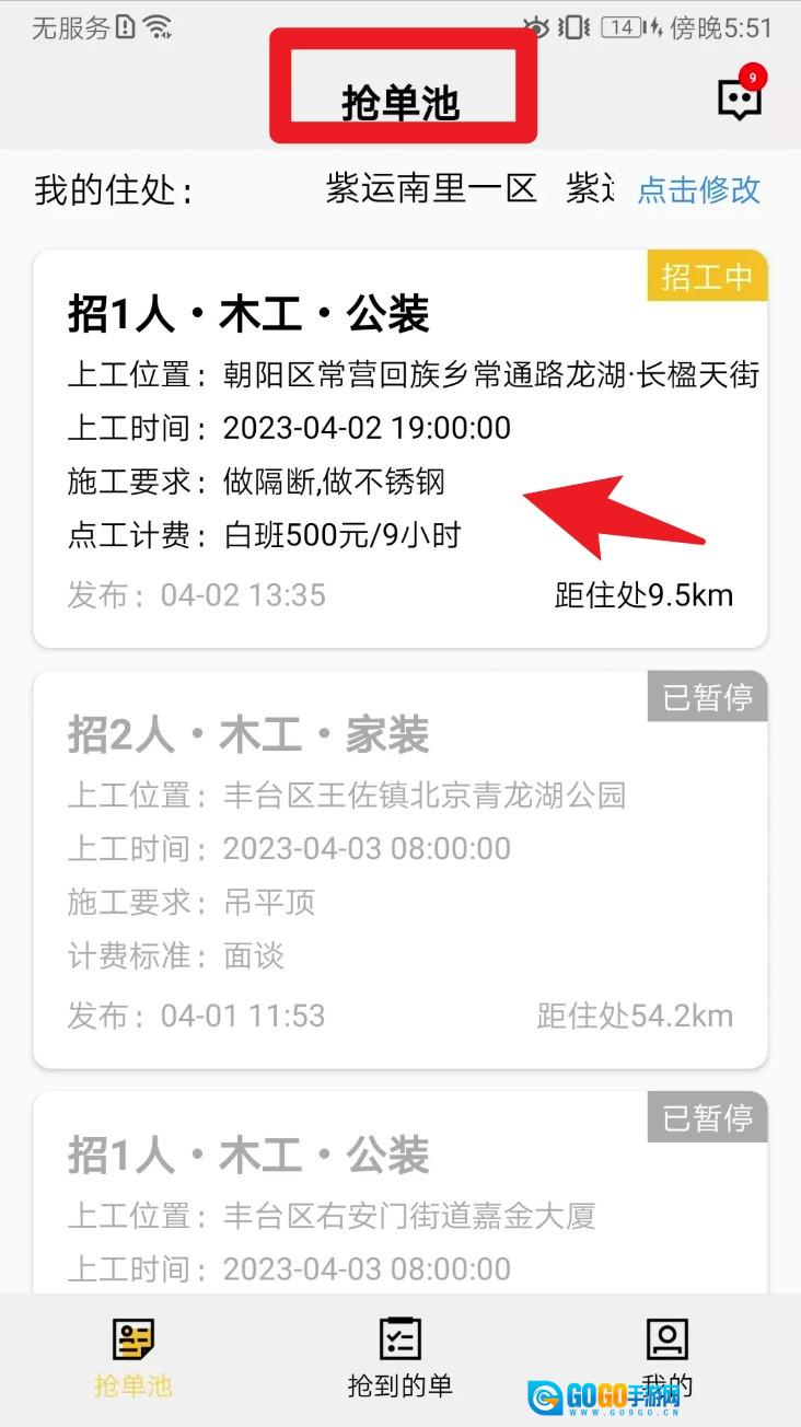 3. 切换到抢单池页面,就能查看实时的招工信息,其中包含上工时间、施工要求、计价方式以及距离位置等内容。