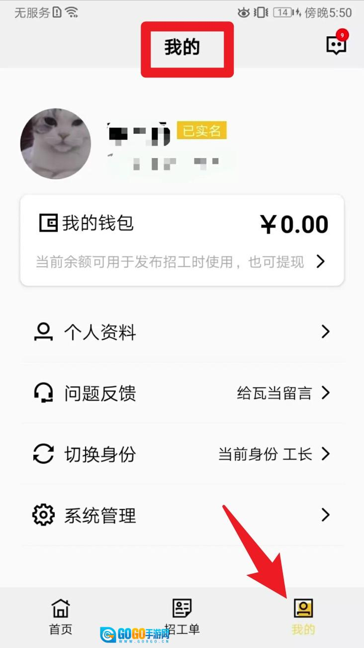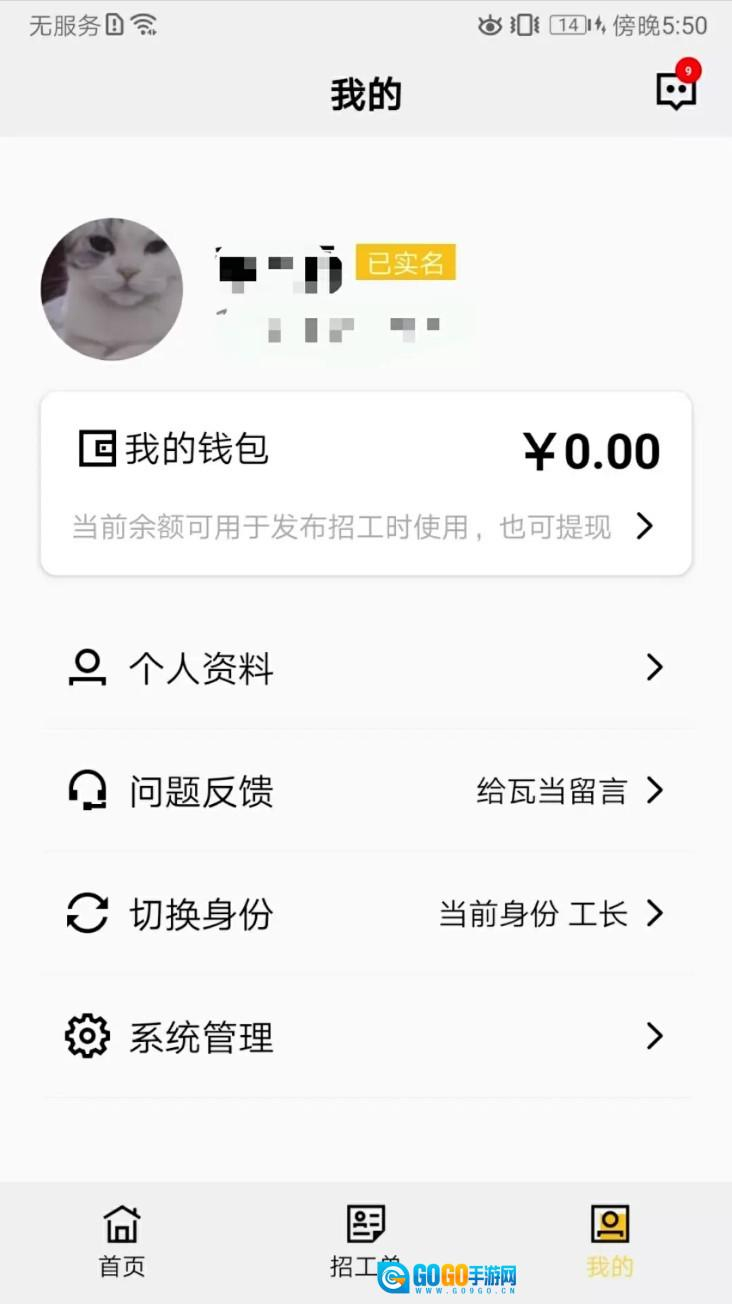 4. 点击底部的“我的”进入个人中心,在这里能够查看钱包余额和身份信息,同时可以切换工长或工人身份进行使用。