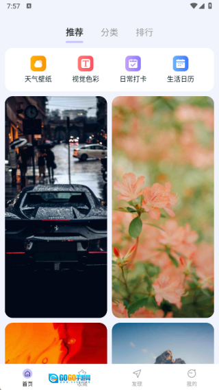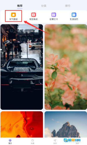 1、打开时刻壁纸,在首页中提供了天气壁纸、视觉色彩、日常打卡以及生活日历的功能。