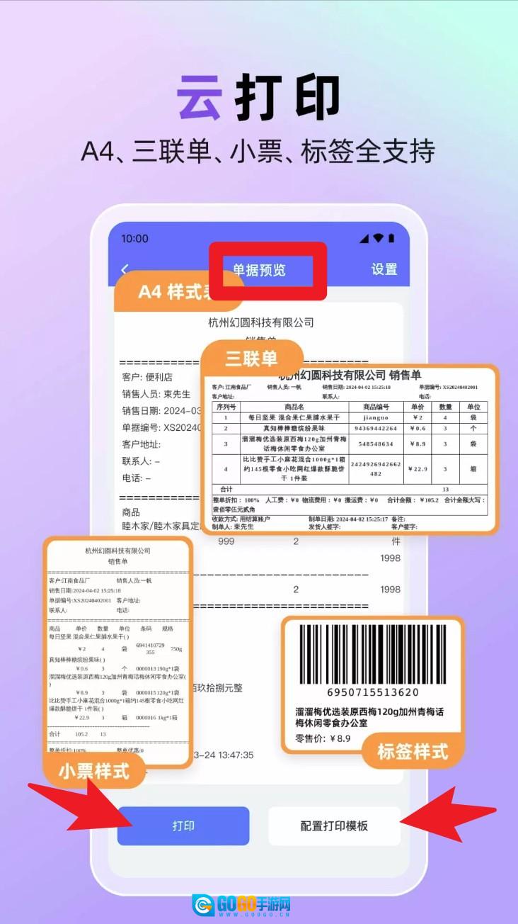 5. 进入打印界面后,可选择三联单、小票或标签样式,并点击打印或配置打印模板完成云打印。
