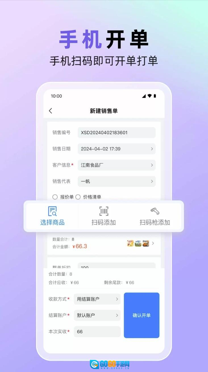 1、 扫码录入:支持手机扫描商品条码创建单据,系统自动同步进出库明细,减少人工记录。