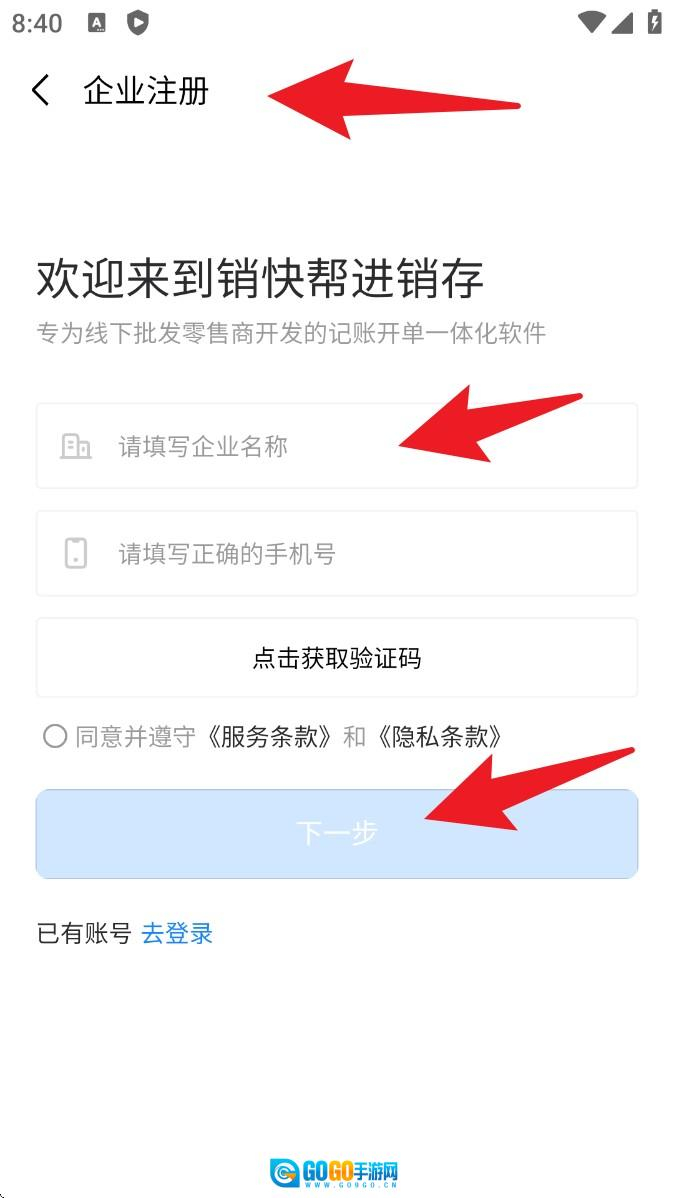 1. 进入App后点击企业注册,填写企业名称与手机号,获取验证码并同意协议,点击下一步完成注册。
