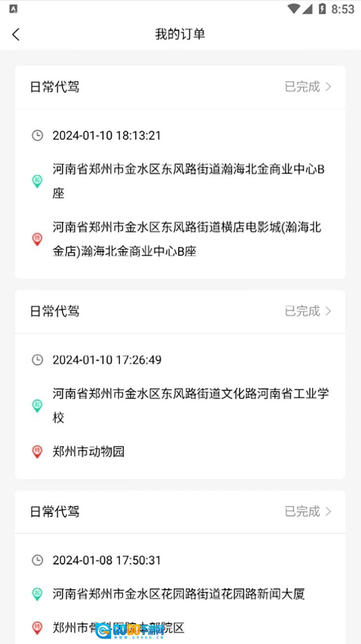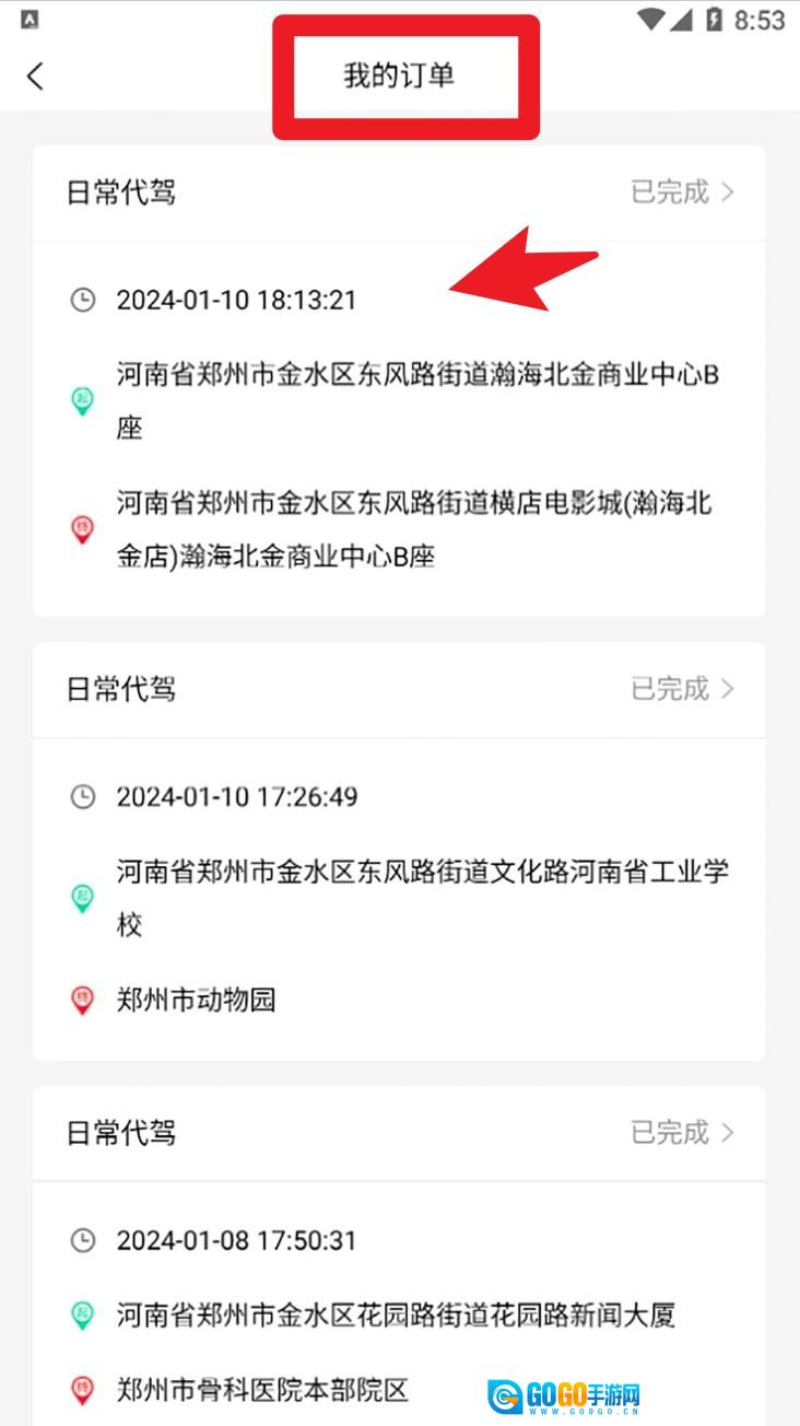 4. 点击我的订单进入订单管理页,可查看每一笔代驾任务的详细时间、地址与完成状态。