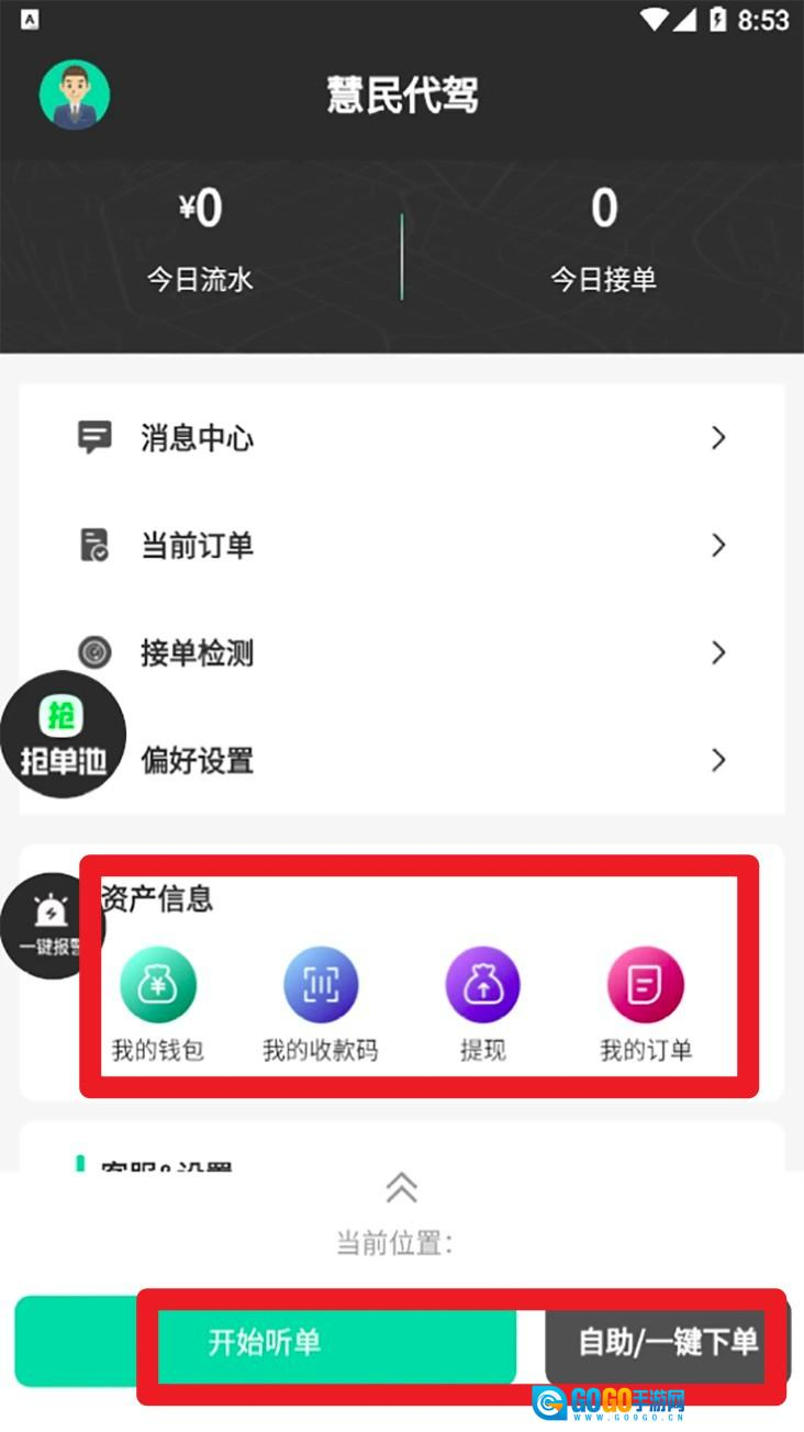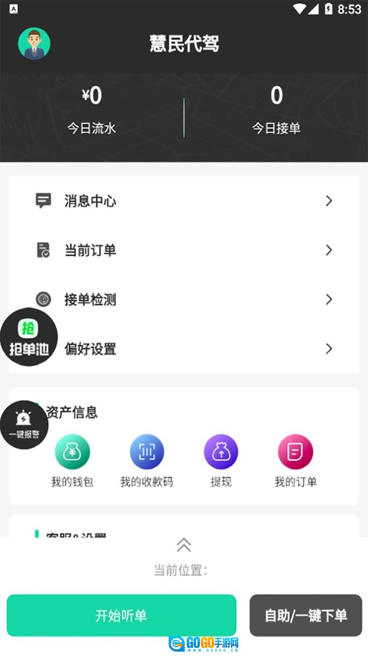 3. 登录成功后进入主界面,可查看今日流水与接单数,点击开始听单即可开启接单状态。