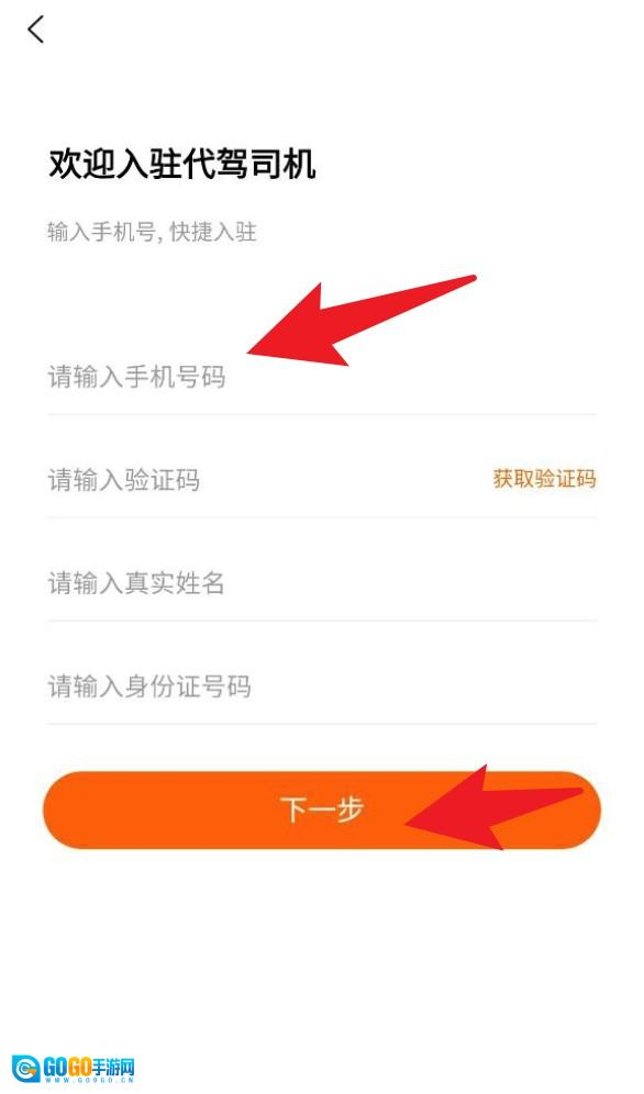 1. 打开App进入注册页面,按提示填写手机号码、验证码、姓名与身份证信息后点击下一步。
