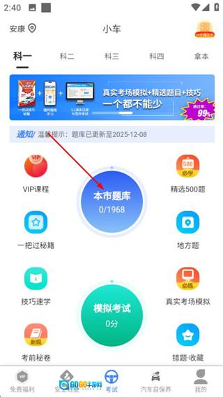 1、打开学车管家的考试页面,找到并点击“本题库”选项,即可进入科目一的顺序练习页面。