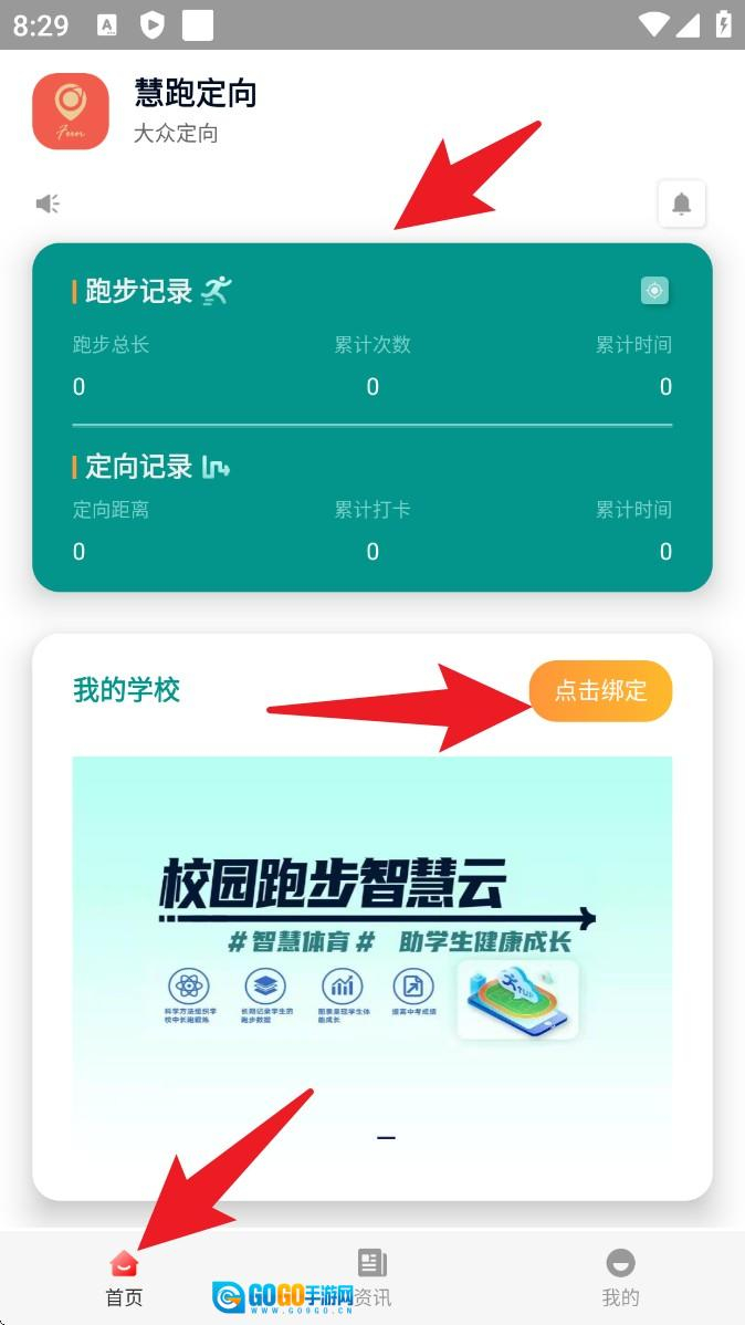 2. 登录后会默认进入首页,在首页可以查看跑步和定向运动的记录,还能点击绑定按钮来绑定学校账号,通过底部导航栏则可以切换到资讯页面。
