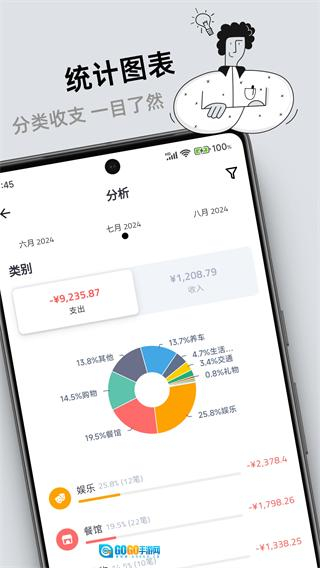 会自动将用户录入的收支数据转化为柱状图、饼图等图表,清晰展示消费结构与资金流向,让用户能快速定位高消费领域,为消费优化提供数据支撑。