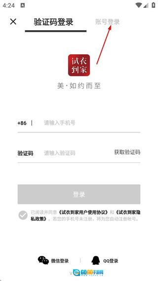 3、在验证码登录页面,点击账号登录,切换至账号登录界面。